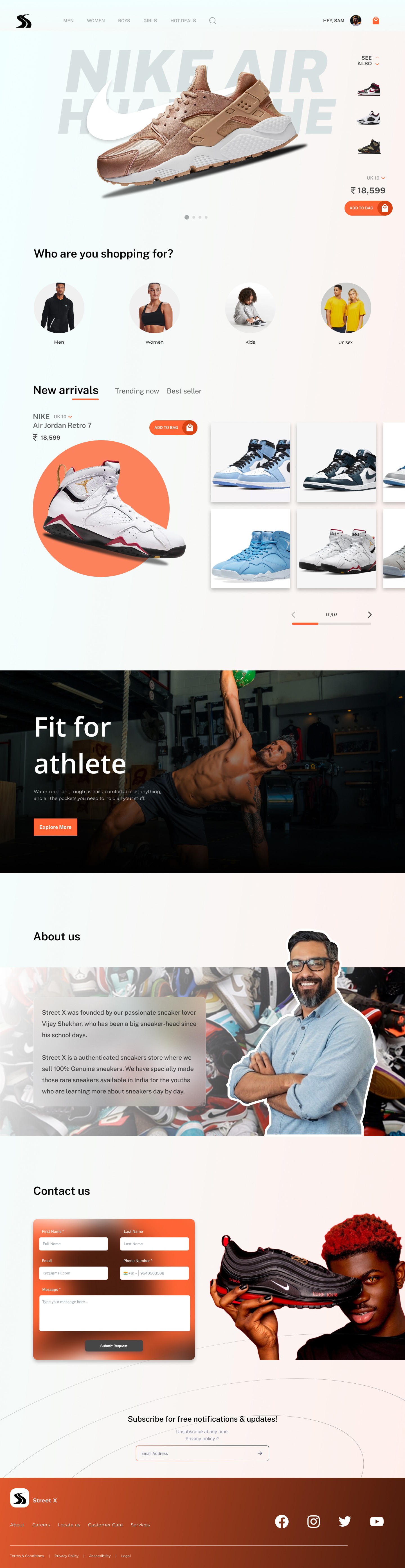 The Street X UI/UX is sleek, modern, and user-centric, with a clean layout, bold typography, and high-quality visuals. Smooth navigation, intuitive categorization, and engaging micro-interactions enhance the shopping experience. Contrasting colors, soft gradients, and clear trust-building sections ensure accessibility and responsiveness, creating an immersive experience for sneaker lovers.